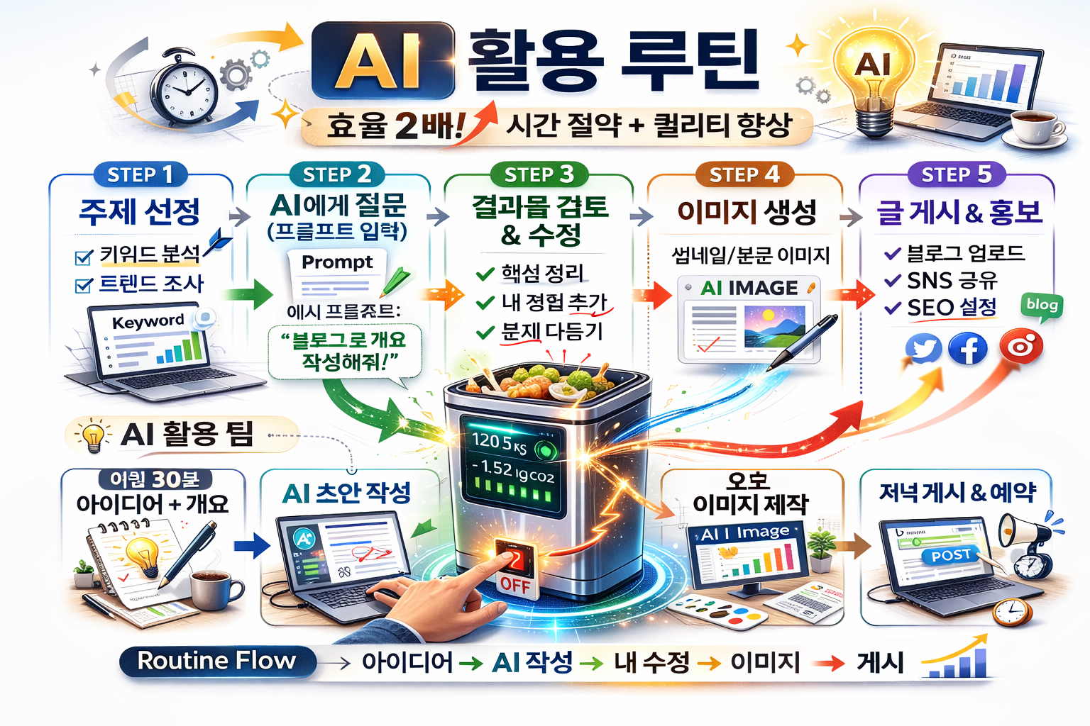 AI루틴은 도구보다 ‘흐름’을 만드는 것이 핵심이다AI 도구를 몇 개 알고 있다고 해서 생산성이 바로 올라가지는 않는다. 나도 처음에는 ChatGPT, 번역기, 요약기, 이미지 생성 도구를 각각 따로 사용했다. 그때는 분명 편리하다고 느꼈지만, 전체적인 시간 절약 효과는 생각보다 크지 않았다. 이유는 단순했다. 도구는 있었지만 루틴이 없었기 때문이다. AI루틴의 핵심은 특정 도구를 잘 쓰는 것이 아니라, 하루의 흐름 안에 자연스럽게 녹여 넣는 것이다. 예를 들어 블로그 글을 쓸 때는 초안 작성 → 구조 정리 → 이미지 제작까지 한 번에 연결하고, 업무에서는 자료 요약 → 표 정리 → 보고 문장 다듬기까지 이어지는 흐름을 만든다. 이런 구조가 잡히면 AI는 개별 도구가 아니라, 하나의 생산성관리 시스템처럼..